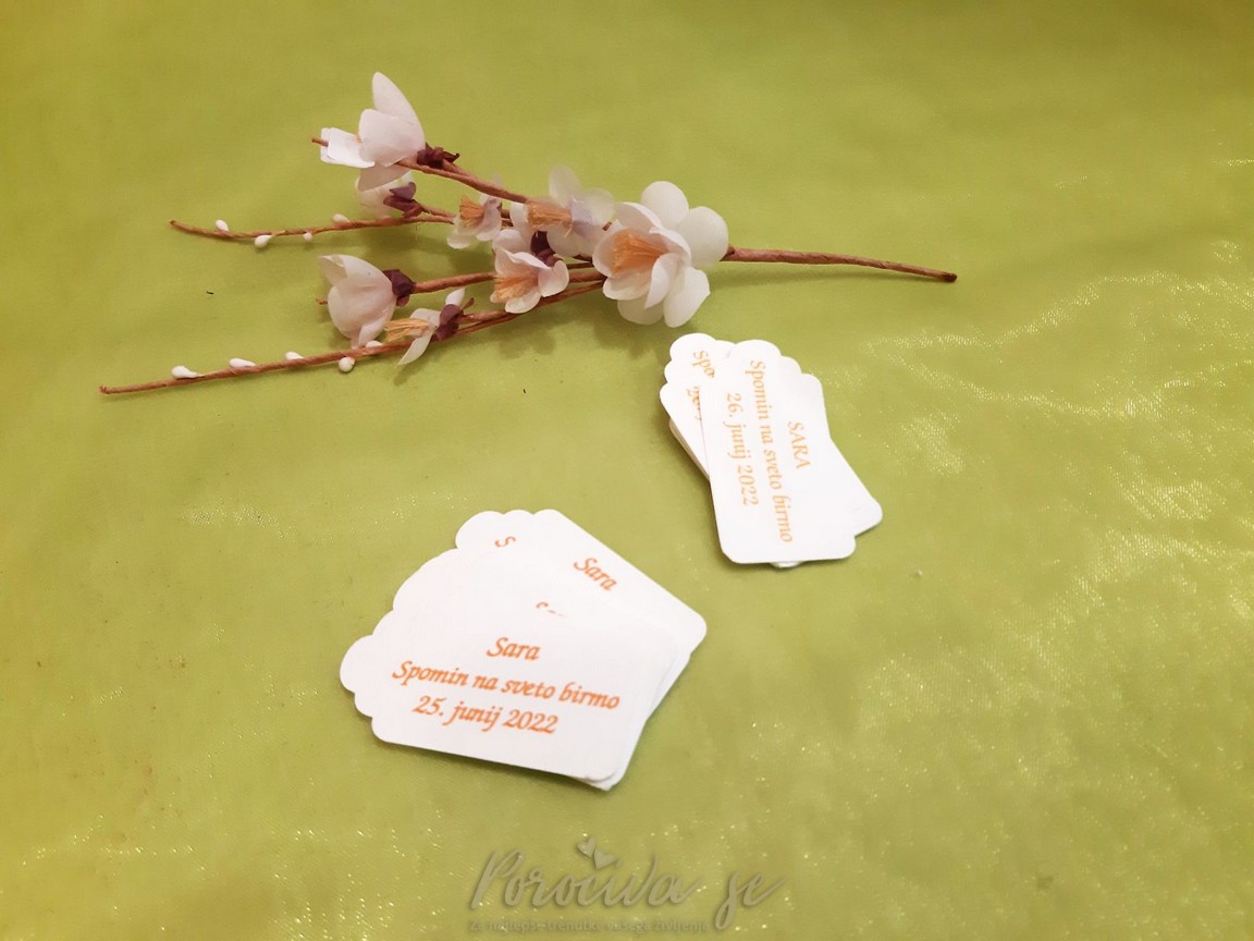 Kartončki za darila kot personaliziran dodatek so nepravilne oblike, velikost cca. 1,8cm x 4cm. Za lažje pritrjevanje ima vsak kartonček luknjico, da ga lahko pritrdite na darilo. Na kartončku je lahko ime slavljenke/slavljenca, samo začetnici ali številka, ki se obeležuje, beseda Hvala ipd. Barva papirja se lahko spremeni in jo izberete ob naročiilu. V kompletu je 10 kom natisnjenih kartončkov.