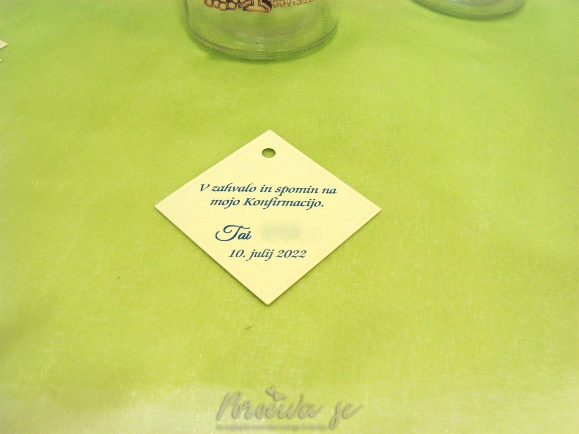 Kartončki za darila kot personaliziran dodatek so kvadratne oblike, velikost je cca. 5cm x 5cm. Za lažje pritrjevanje ima vsak kartonček luknjico, da ga lahko pritrdite na darilo. Na kartončku je lahko ime slavljenke/slavljenca, samo začetnici ali številka, ki se obeležuje, beseda Hvala ipd. Barva papirja se lahko spremeni in jo izberete ob naročiilu. V kompletu je 10 kom natisnjenih kartončkov.