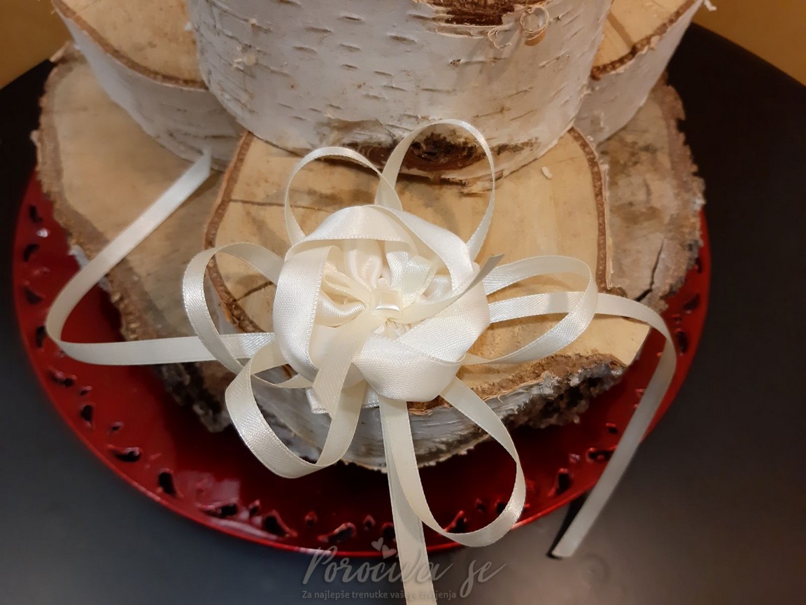 Kotiljon je narejen iz širokega satenastega traku, ki ga dopolnjuje preplet ozkega saten traku in perla na sredini. Na zadnji strani ima kotiljon sponko za pritrditev. Velikost je cca. 10cm.