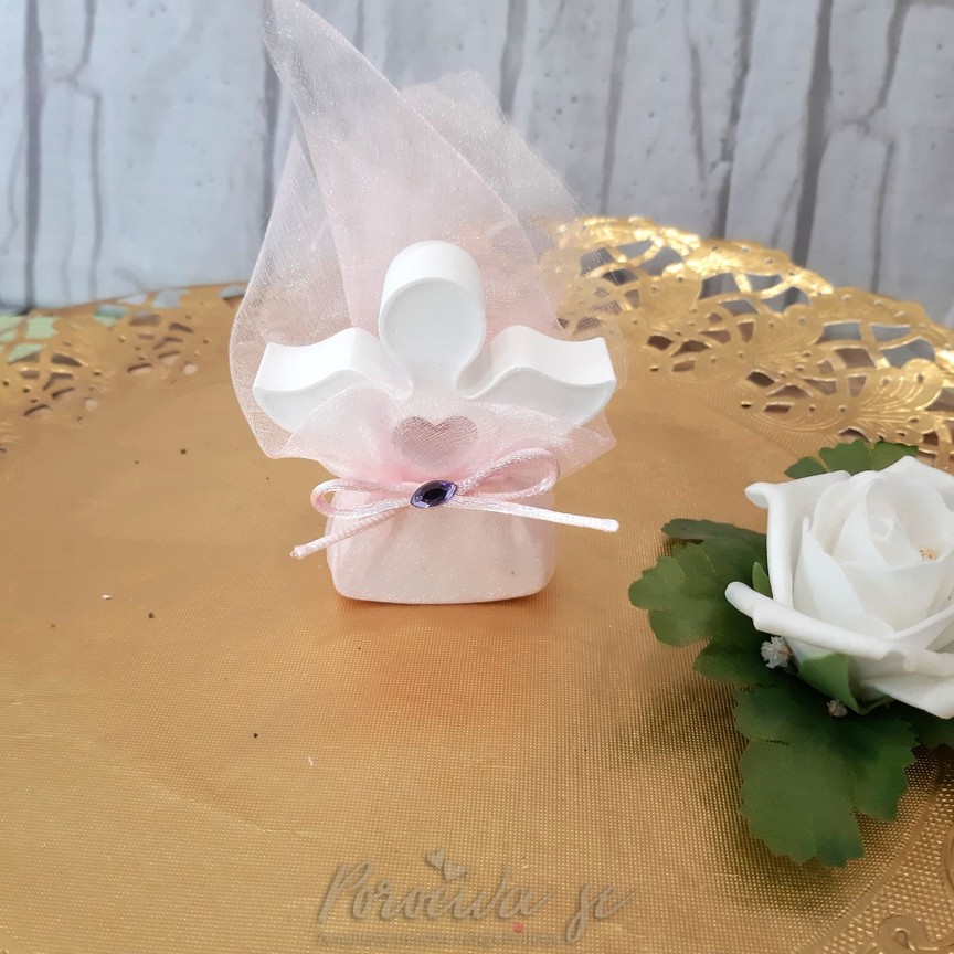Stoječi beli angel s srčkom na sredini je ovit v nežno roza organco in prevezan s svilenim trakom. Barva organce je lahko tudi bela ali nežno modra. Dodamo še napis z imenom slavljenke/slavljenca in datumom dogodka.