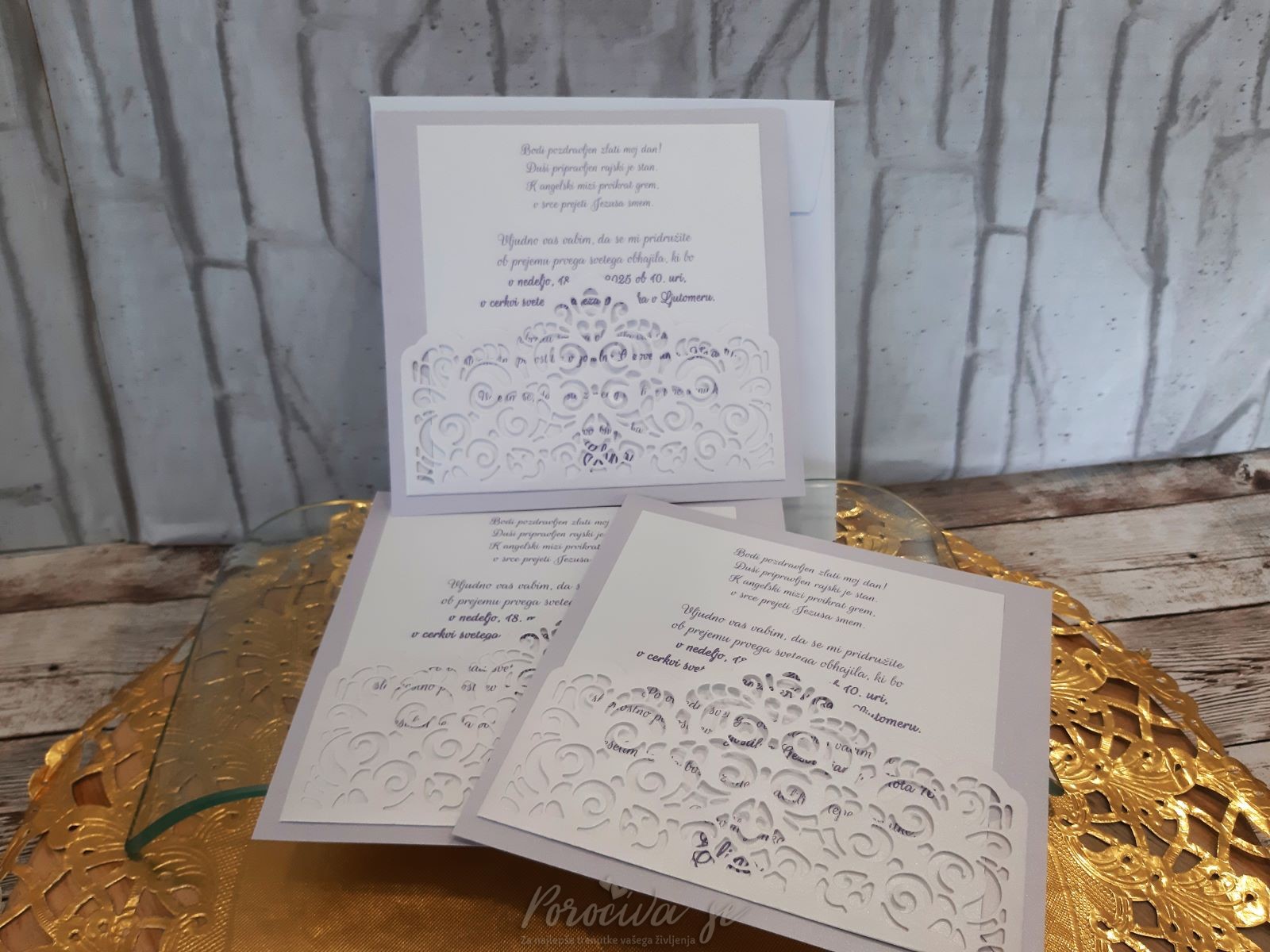 Vabilo za zakrament s čipko iz papirja na sprednji strani. Slavljenka ali slavljenec povabita svoje sorodnike in prijatelje na praznovanje svečanega dogodka. Vabilo je primerno za obhajilo, birmo ali konfirmacijo.