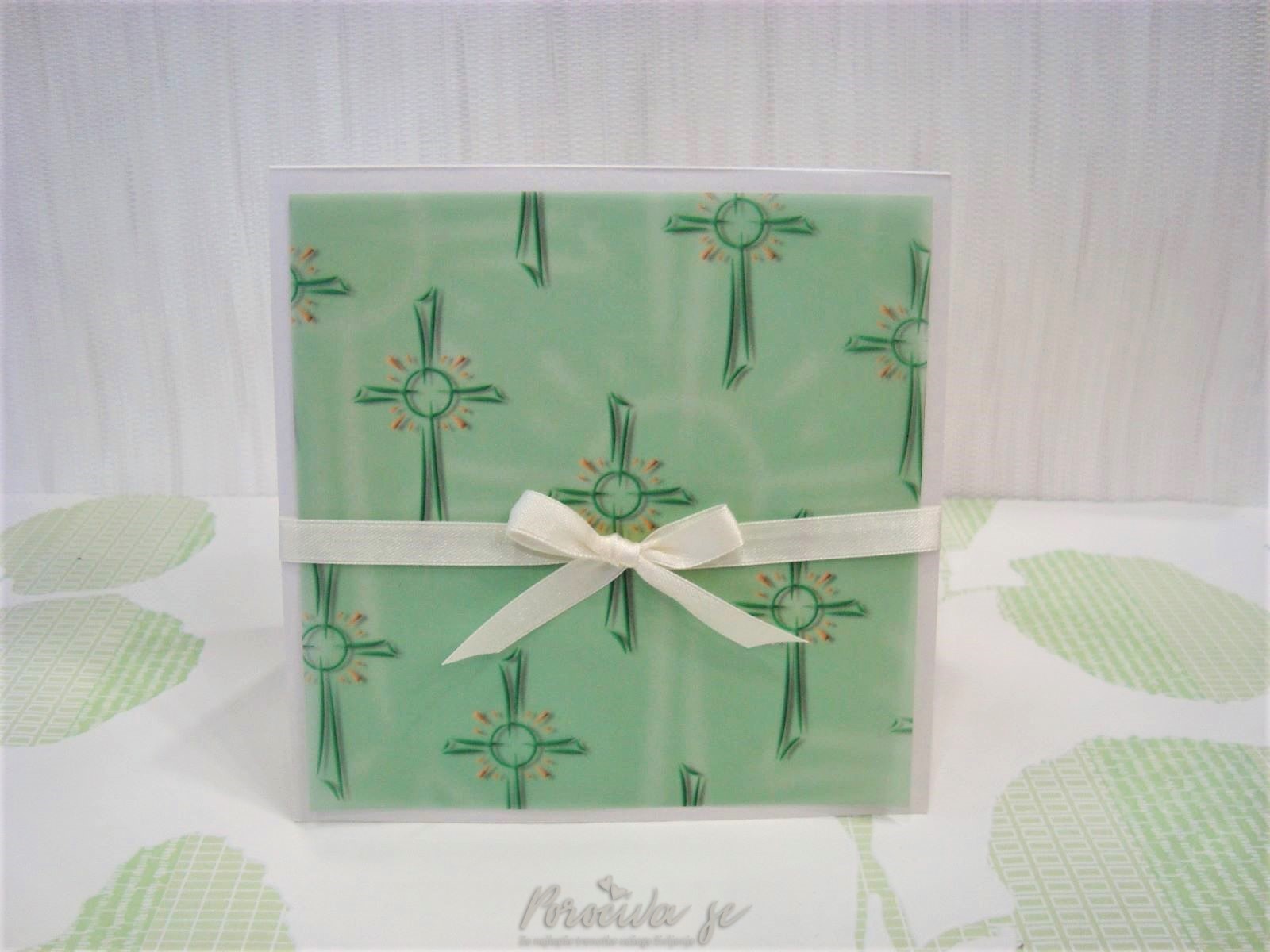 Vabilo za zakrament je kvadratne oblike in se odpira od spodaj navzgor. Velikost vabila je cca. 15cm x 15cm. Na sprednji strani je čez celo stran motiv s križem in trak prevezan v pentljo. Model vabila je primeren tudi za krst. Vabilo ima pripadajočo kuverto.